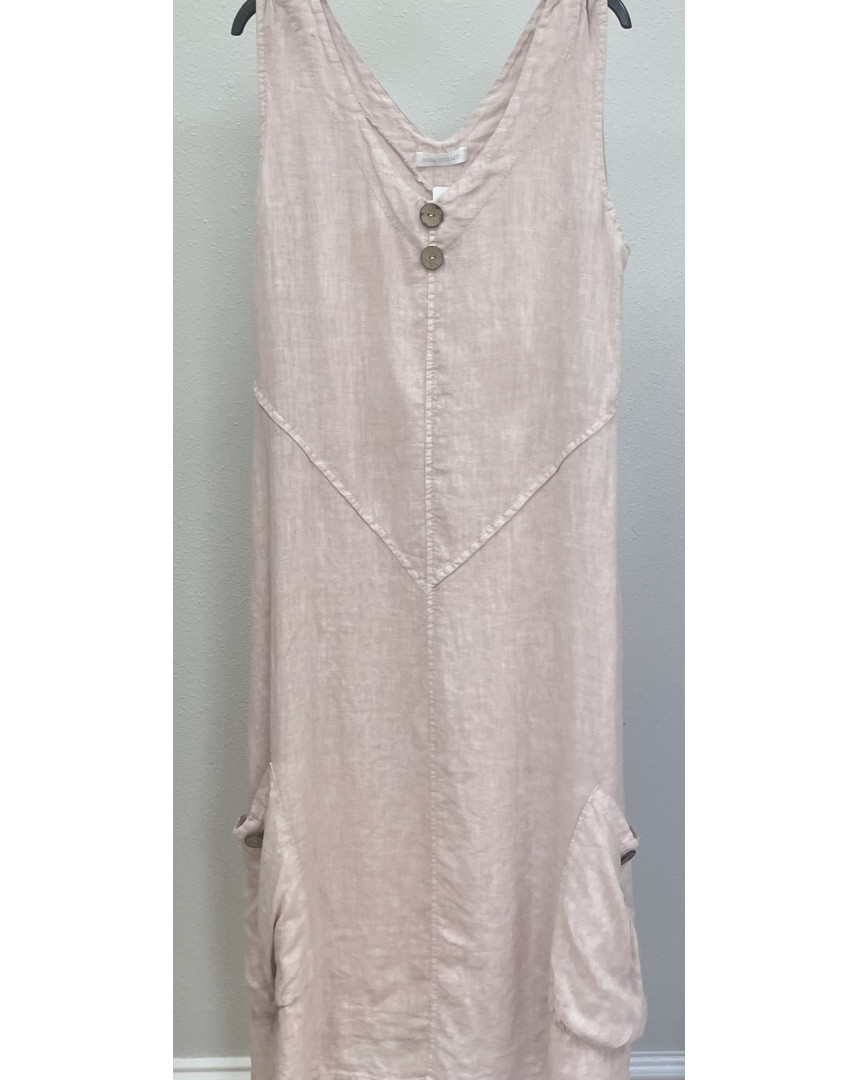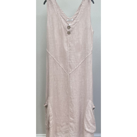 Long Linen dress, asymmetric bottom, sleeveless, fashion V neck and V back. stretch bands at the back. Design by your wholesaler Look Mode.Made in Italy.