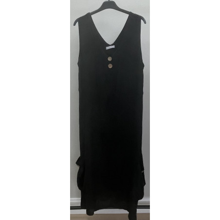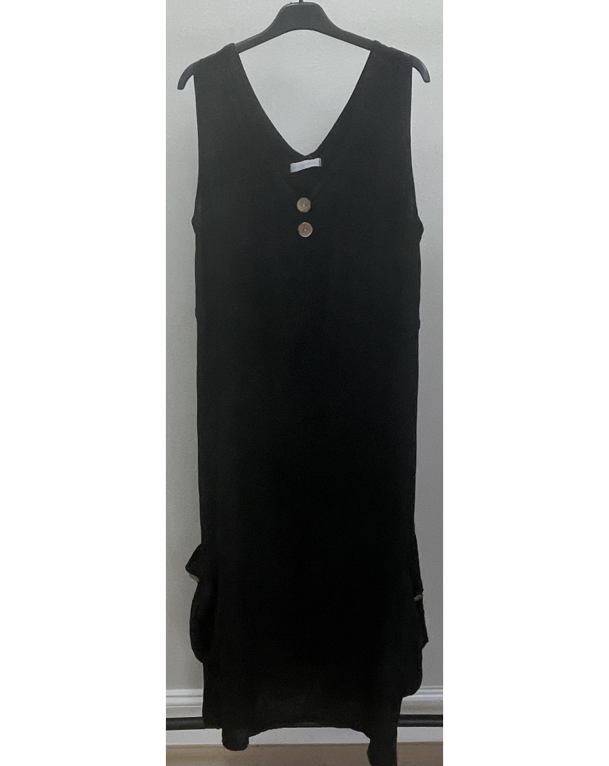Long Linen dress, asymmetric bottom, sleeveless, fashion V neck and V back. stretch bands at the back. Design by your wholesaler Look Mode.Made in Italy.