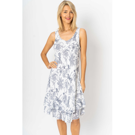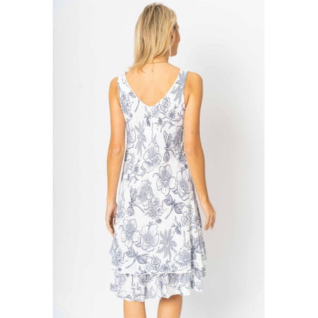 Sleeveless New Flower Print Dress. V-neck front and back. Fully lined with double layer at the showing at hem.